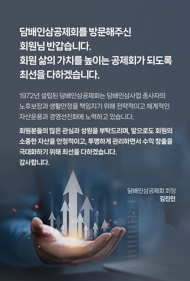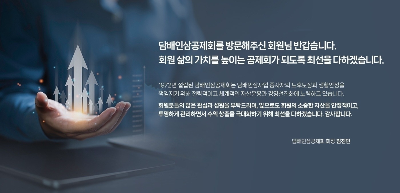 담배인삼공제회는 퇴직 후 생활 안정과 회원복지 향상을 위해 지금도 노력합니다. 담배인삼공제회는 퇴직 후 생활 안정과 회원복지 향상을 위해 지금도 노력합니다.